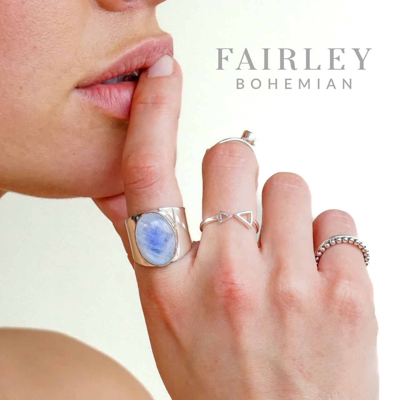 Perfectly finished moonstone rings, carved from the raw crystal. Polished adjustable plain silver rings and bangles. Spinning rings that glide effortlessly. A distinct focus on providing quality boho jewellery UK.